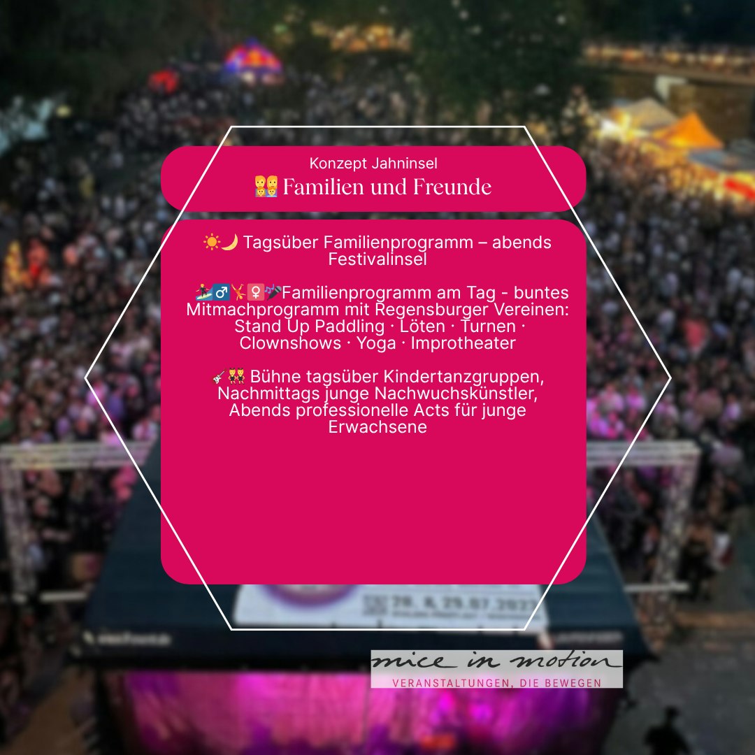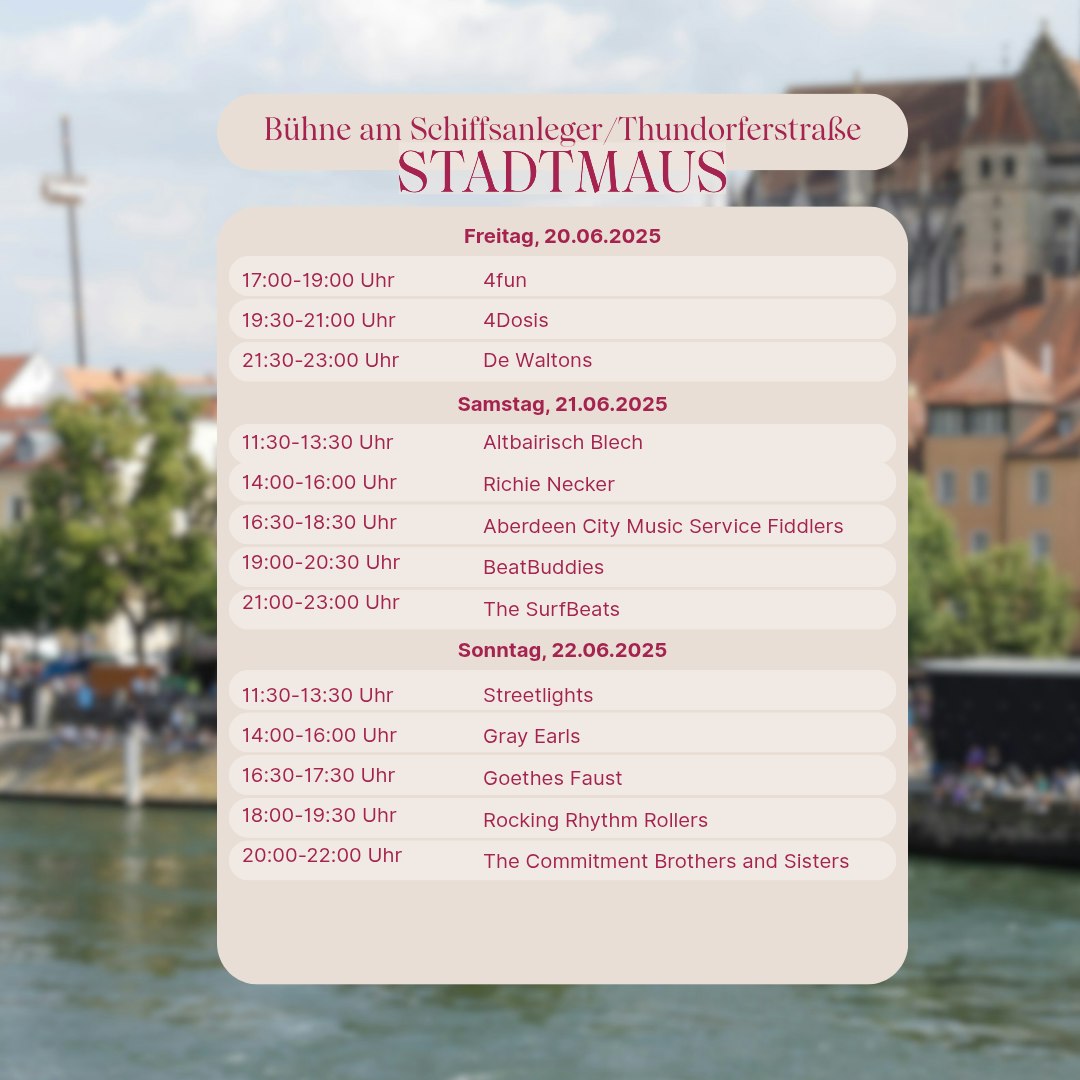 Nach langjähriger Zwangspause durfte das Bürgerfest 2023 endlich wieder ganz Regensburg raus in die Stadt locken und seine Gäste an verschiedenen Orten in der ganzen Stadt mit kulinarischen Genüssen und musikalischen Höhepunkten, sowie spannenden Ausstellern und aktiven Programmen willkommen heißen. Wir durften die Thundorferstraße in eine Genussmeile und die Jahninsel tagsüber in ein Kinder- und Familienparadies und abends in den größten Club der Stadt verwandeln. Großartige Künstler und Bands, hervorragende kulinarische Genüsse aus aller Welt und bestgelaunte Gäste machten das Bürgerfest zu einem absoluten Highlight! Und auch in diesem Jahr sind wir wieder mit dabei. Unter dem Motto „Miteinander!“ findet 2025 wieder das Bürgerfest statt und auch in diesem Jahr bespielen wir für euch ein paar Plätze! Die STADTMAUS darf die Thundorferstraße und den Domplatz bespielen. Unsere Schwesterfirma und Eventpartner Mice in Motion darf die Jahninsel und den Neupfarrplatz bespielen.
